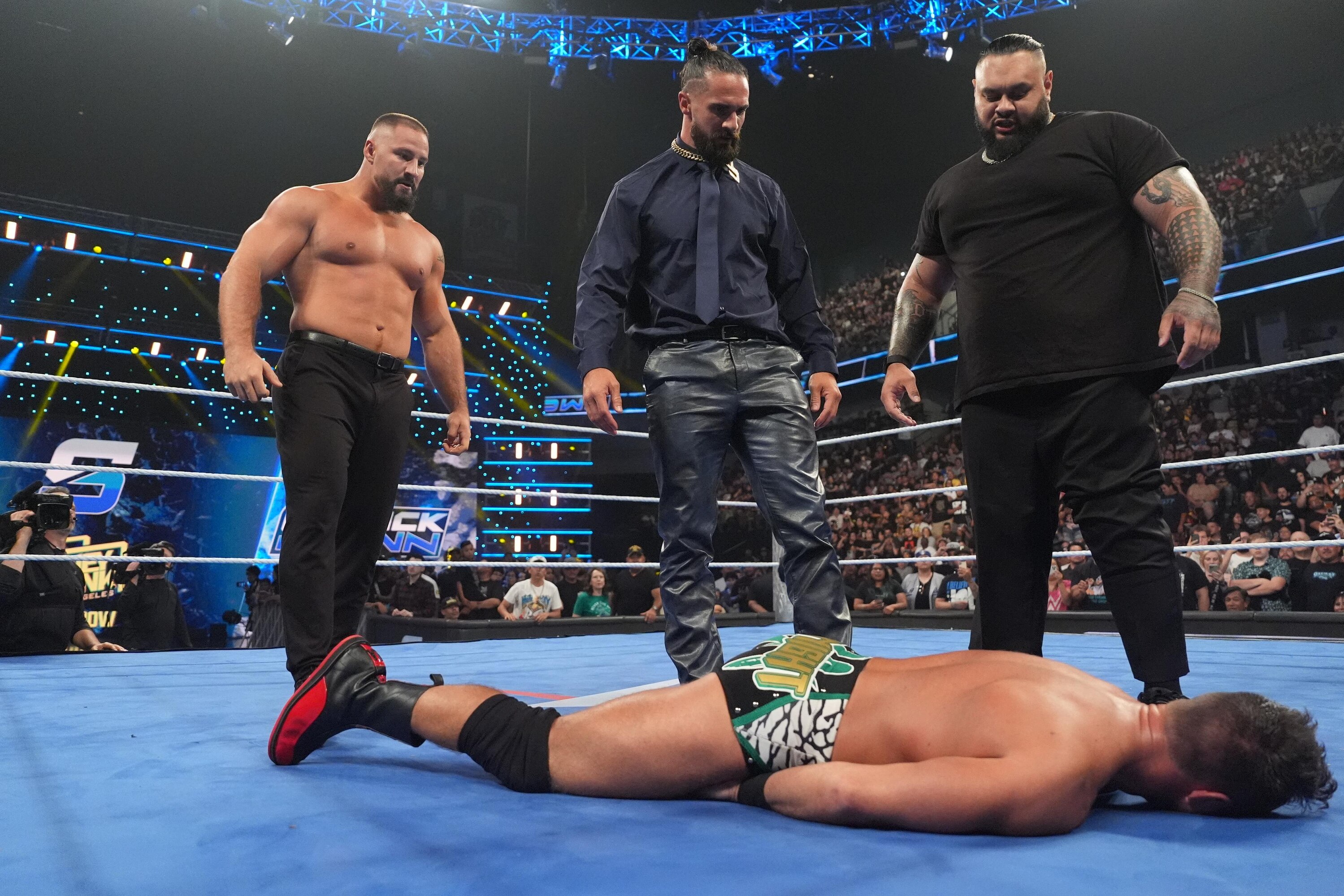 Rollins launched into a backflip off the ropes following a flying senton but landed awkwardly on his right knee, immediately collapsing and retreating to the corner near Paul Heyman.